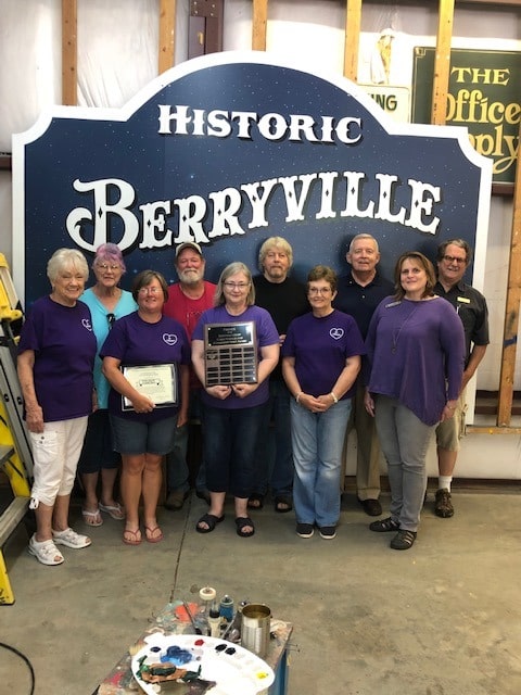 James Abbott and Randal Rust receive the Carla Youngblood Community Spirit Award from Carla Youngblood and Friends president Ann Richardson for their work on the murals on the Berryville Square